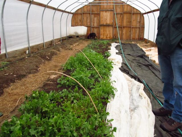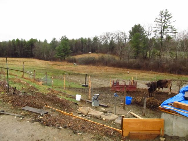 Site remediation around the new ox barn includes used burlap bags filled with wood chips and innoculated with mushroom spawn. Starting to catch and sink water.