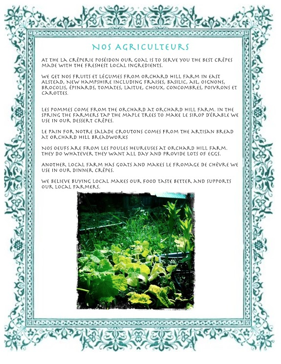 Jeremiah has a very strong connection to Orchard Hill, having gone to the Orchard School for preschool, kindergarten, summer camps and the after school Farmers and Foragers program. He has helped with planting and harvesting crops, tapping trees, collecting sap and boiling it into maple sugar, building pens and coops for pigs and chickens, and cooking and eating food from the farm. In 2011 when he was in in 5th grade at Marlow's John D. Perkins, Sr. Elementary School, just a short drive from Orchard Hill, Jeremiah came home with an assignment to create a menu for a “creperie” or a crepe restaurant. He decided to pretend that his restaurant “The Poseidon Creperie” bought its food from Orchard Hill and other area farms. It made perfect sense that he would want his restaurant (named after his favorite Greek god discovered through the Percy Jackson book series) to support local farmers. He even put in the extra effort to write the paragraphs about supporting local food! Here is his final project.