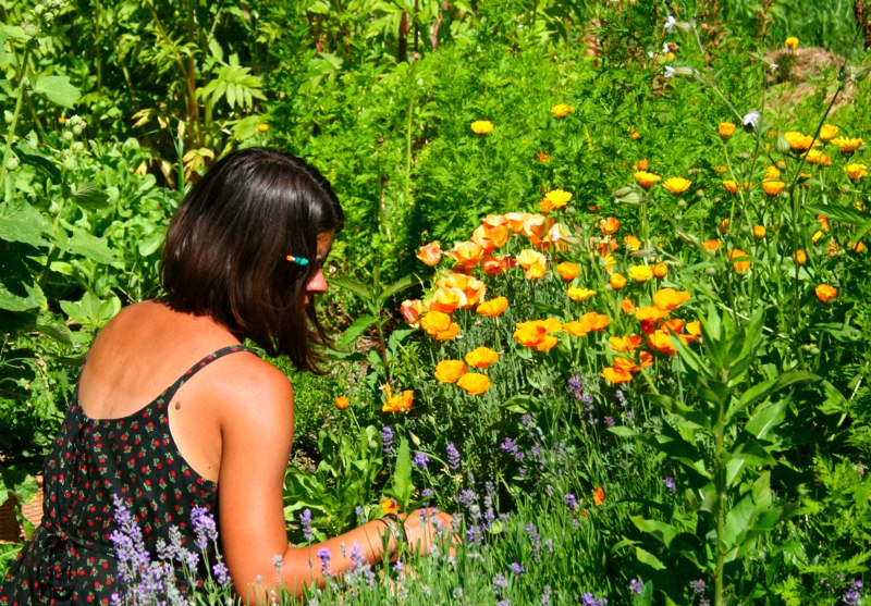 Ellen with California poppies, lavender and valerian